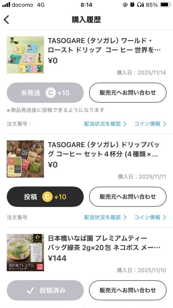 私も実際に体験してみたところ、なんと1日でコーヒーを無料で手に入れることができました。さらに3日後にはもう1回無料でコーヒーをゲット。また、お茶も144円で入手できました。